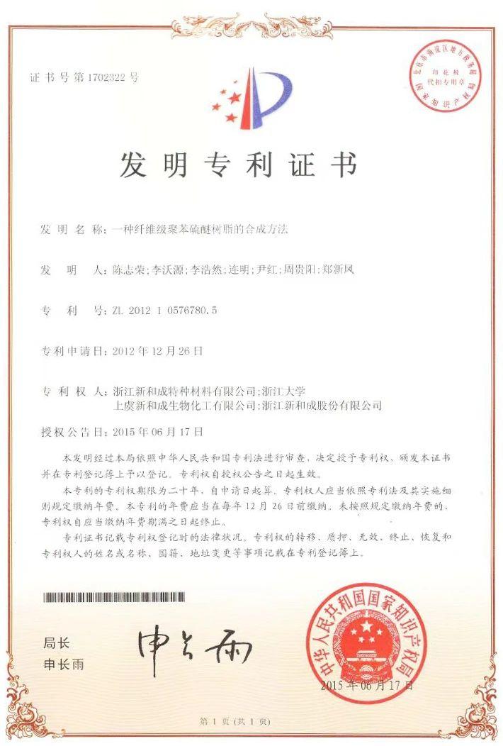 近日,根据《浙江省人民政府关于表彰第一届浙江省知识产权奖获奖者的决定》,第一届浙江省知识产权奖获奖名单公布。浙江新和成特种材料有限公司联合浙江大学、上虞新和成生物化工有限公司、浙江新和成股份有限公司共同申请的发明专利“一种纤维级聚苯硫醚树脂的合成方法”( ZL201210576780.5)荣获专利一等奖。